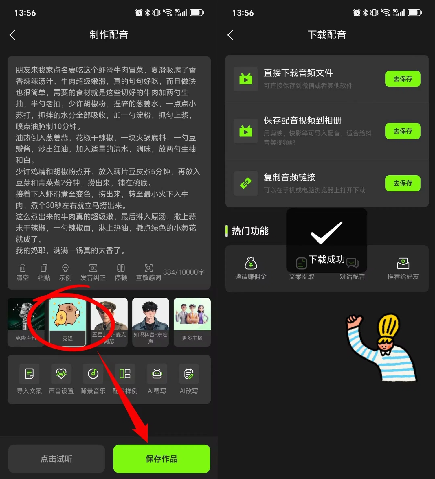 3. 输入提前准备好的文本内容,选择刚才克隆的音色名称,点击“试听”,等待合成完成后,保存作品,导出音视频文件即可。