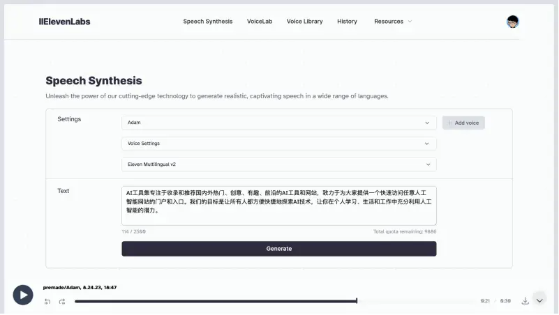 4. 点击“Generate”,15秒内生成克隆声纹,可直接输入文本生成语音或导出声纹模型。