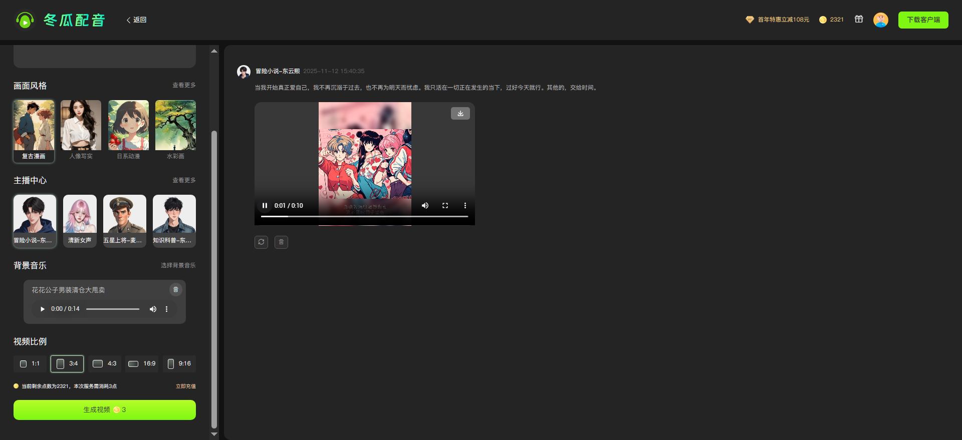 1.从爆款小说中截取强冲突片段(如 “开局逆袭”“秘境寻宝”),复制到冬瓜配音,用 AI 润色功能优化文案,选择画面风格(如:日系动漫、唯美古风、复古漫画等)