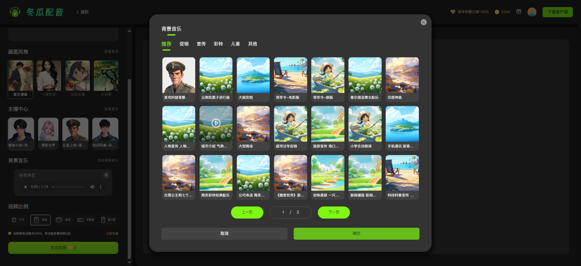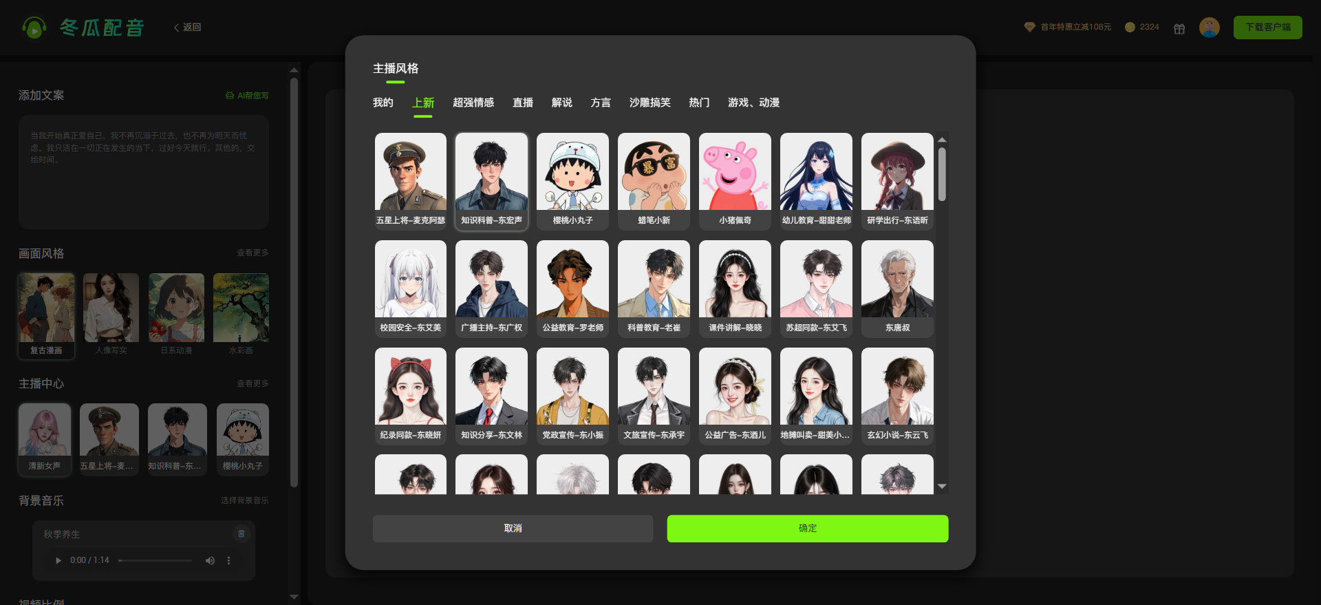 2.然后选择适配的音色(如玄幻选霸气男声,甜宠选软萌女声);