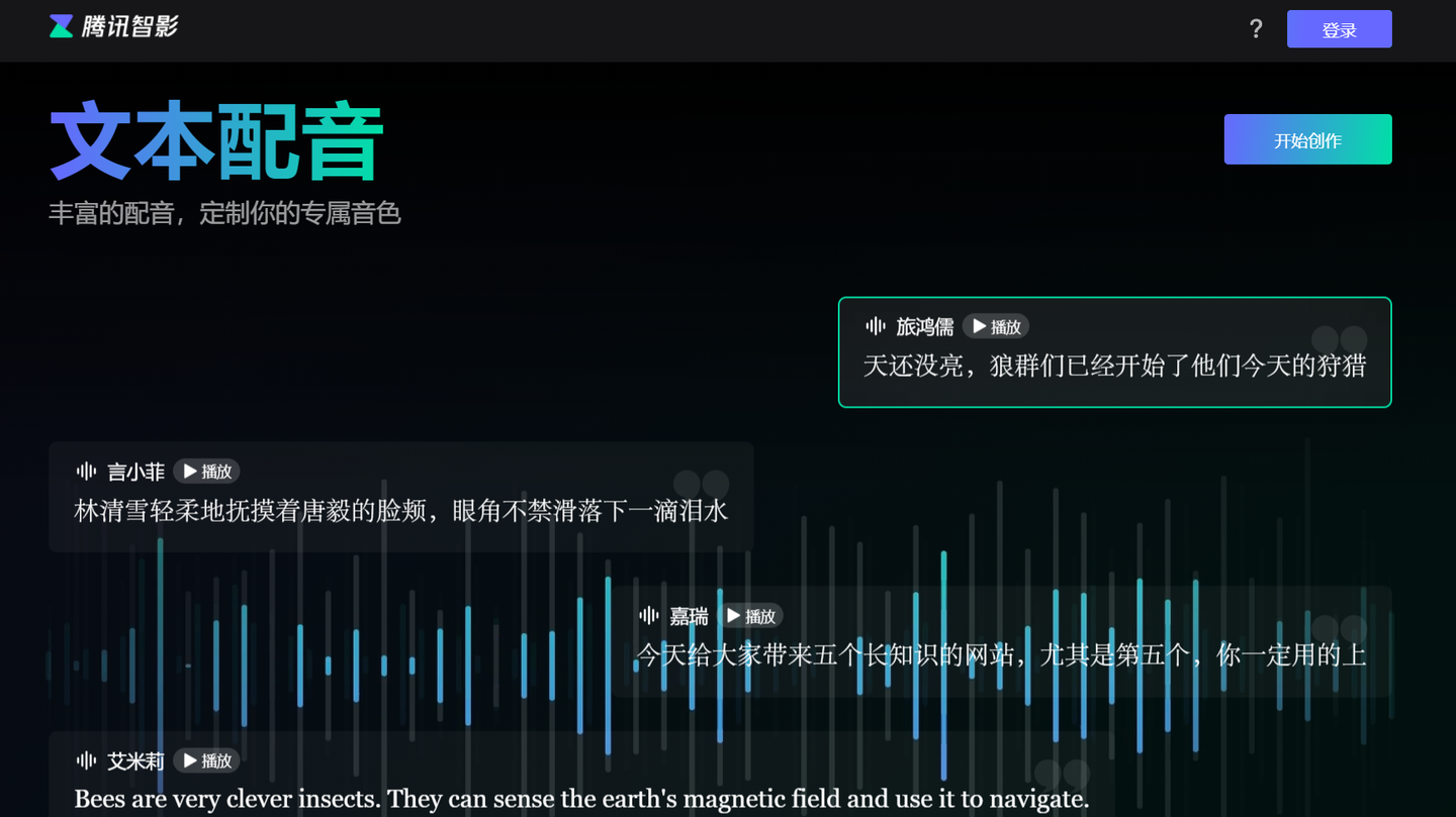 核心优势:腾讯出品的在线工具,无需下载,语音生成与视频剪辑无缝衔接。提供 100 + 主播音色,含方言、虚拟偶像音及 12 种情感风格,支持语速、停顿精细调整,自动同步时间轴字幕(误差≤0.1 秒)。内置 1000 + 视频模板和海量商用素材,免费版支持 1080P 高清导出,无水印限制。