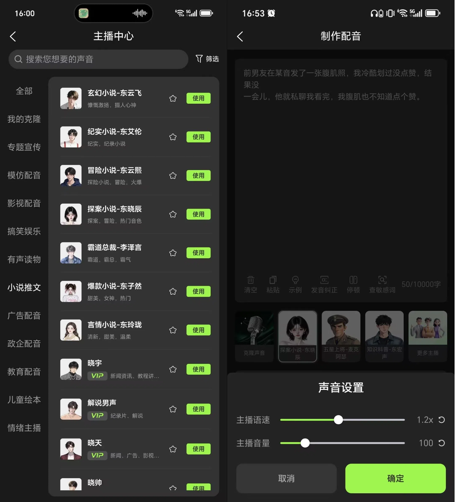 2、选音色 + 调参数:场景化匹配(影视配音、搞笑娱乐、有声读物、小说推文、儿童绘本等)选择想要的声音,语速建议 1.0-1.2 倍;