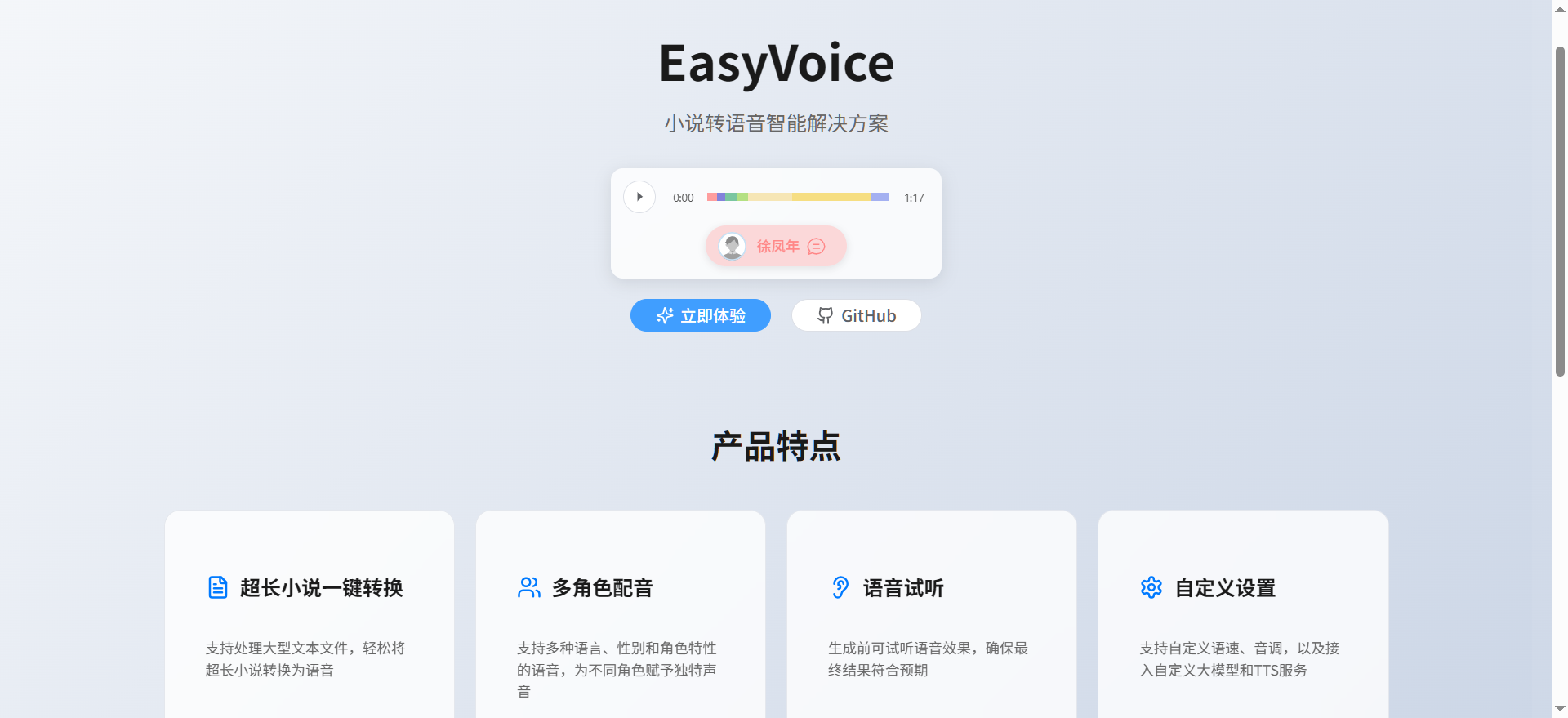 多角色 + 长文案:选「EasyVoice」(开源免费、离线隐私);