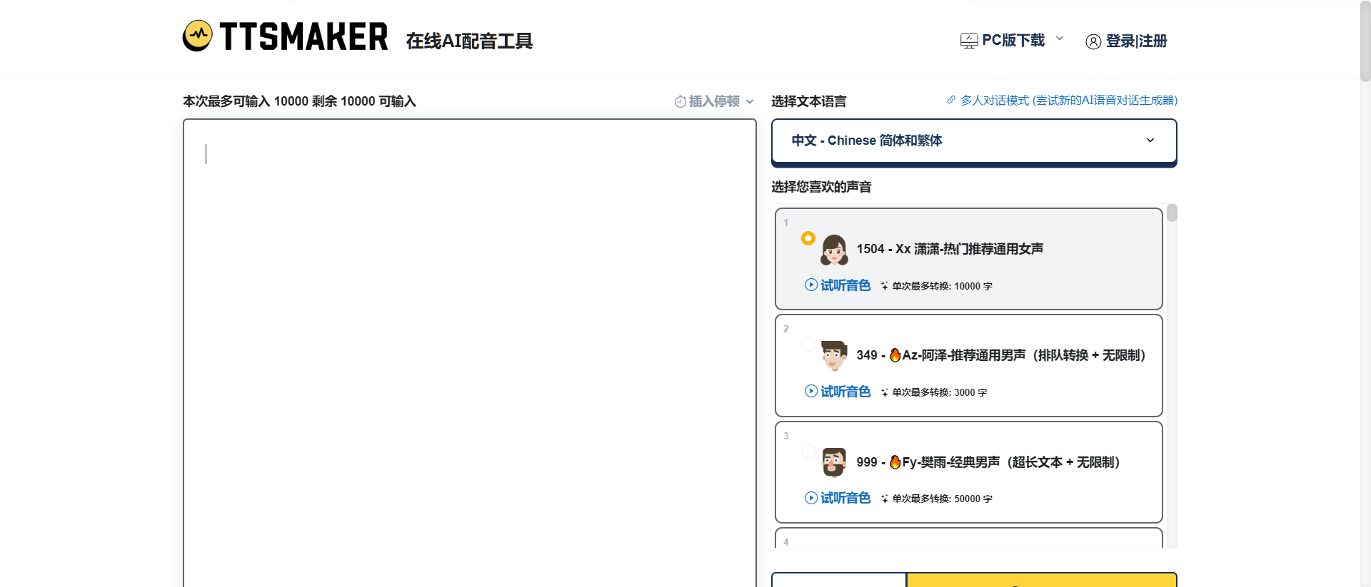 核心优势:以“全功能免费”为核心卖点,依托先进的语音合成技术,在多语种适配与创意音色表现上极具竞争力。无需付费即可享受高清音质输出,无商用版权纠纷,大幅降低中小创作者与跨境用户的配音成本。