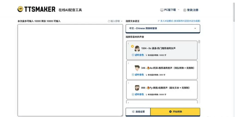 免费政策:每周30000字符免费额度,远超其他软件,部分基础音色可无限免费用,新手福利拉满